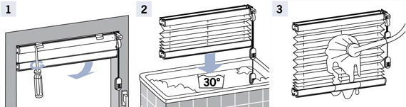 So reinigen Sie Ihre Anlage richtig: Legen Sie das Plissee in ca. 30 °C warmes Wasser mit einem milden Feinwaschmittel. Schwenken Sie es vorsichtig in der Lauge, spülen es anschließend gründlich aus und drücken Sie das zusammengefaltete Stoffpaket sanft aus, bis es nicht mehr tropft. Hängen Sie das Plissee nun feucht in geschlossenem Zustand auf und lassen es an der Luft trocknen. Damit die Falten nicht verkleben, öffnen und schließen Sie den Faltstore während des Trocknungsvorgangs mehrmals.